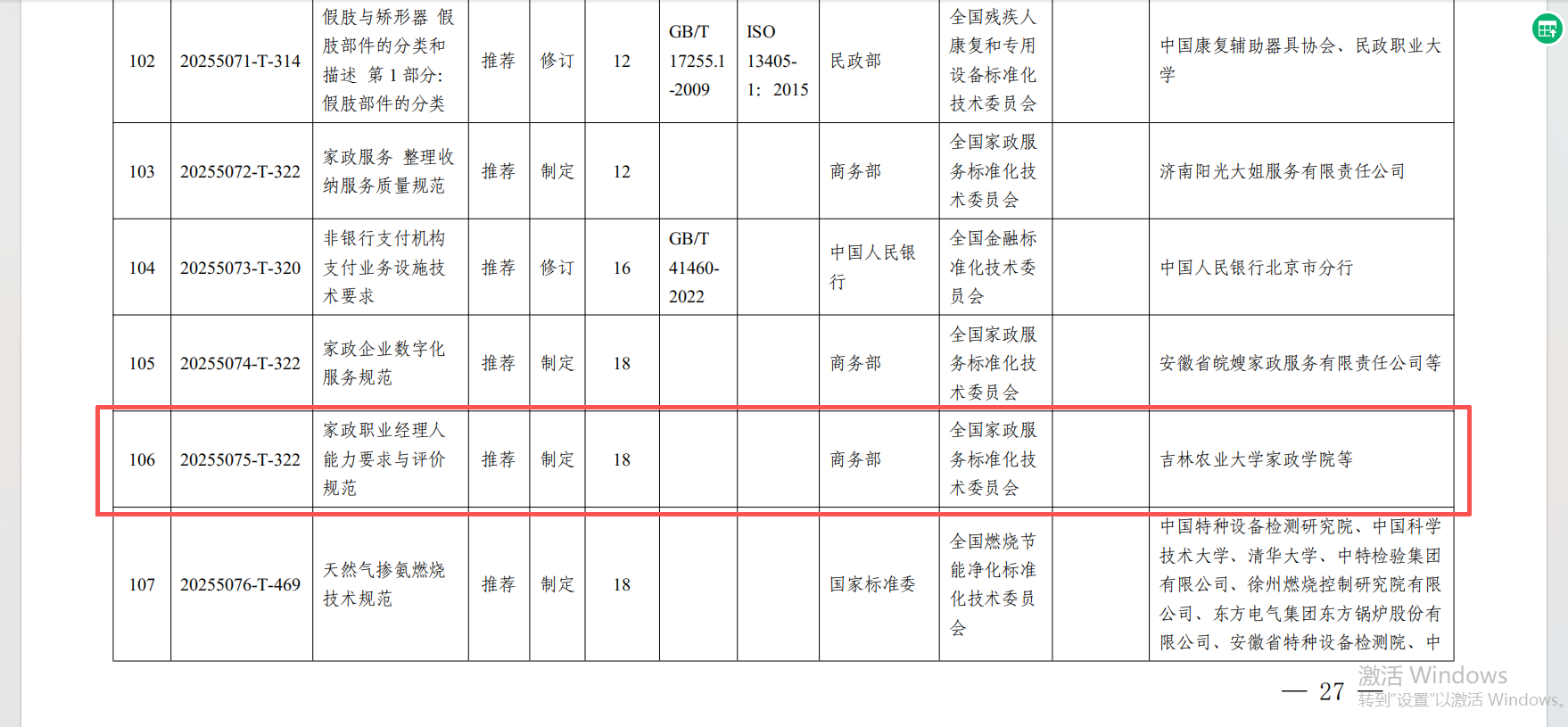 近日,国家标准化管理委员会下达了2025年第九批推荐性国家标准计划及相关标准外文版计划的通知,我院主导申报的《家政职业经理人能力要求与评价规范》国家标准计划项目获批立项。这是我国家政服务领域首部针对职业经理人的国家级标准,标志着家政行业职业经理人资质水平的社会化评价步入规范化、专业化新阶段。