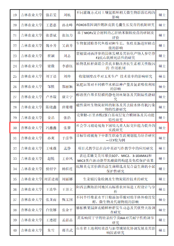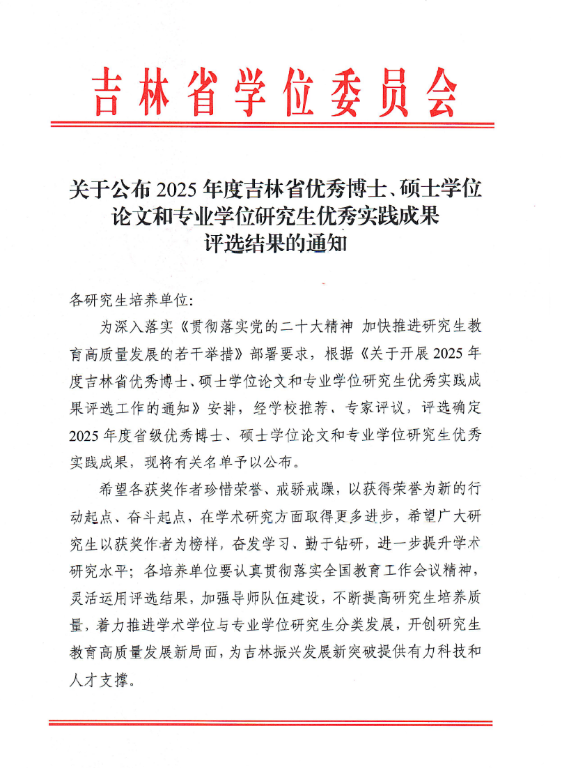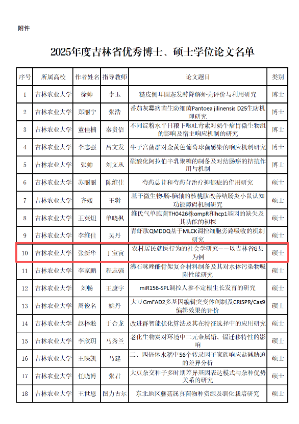 近日,在吉林省学位委员会公布的2025年吉林省优秀博士、硕士学位论文评选结果中,我院丁宝寅副教授指导,2024届社会学专业张新华同学撰写的《农村居民就医行为的社会学研究——以吉林省G县为例》,张黎副教授指导,2024届社会工作专业冯鑫鑫同学撰写的《社会学习理论视角下困境儿童人际交往能力提升的实践研究》被评为“吉林省优秀硕士学位论文”。